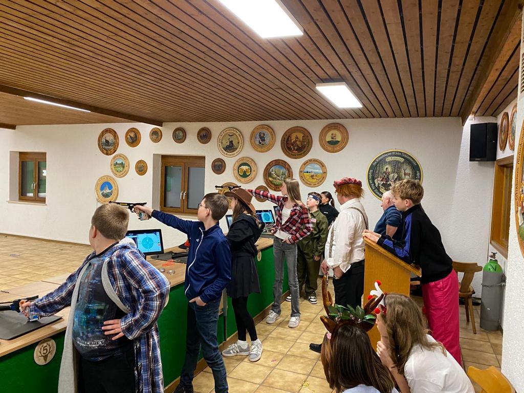 Am Freitag vorm Fasching fand das wöchentliche Training der Schützenjugend in einer etwas anderen Form statt. So kamen die Kinder verkleidet ins Schützenhaus und auch die Jugendtrainer Hans, Franz und Hannes ließen es sich nicht nehmen und schlüpften in Verkleidungen. Der ein oder andere mit normalerweise dünnem Haarwuchs hatte plötzlich wieder die volle Haarpracht. Zunächst wurde ein Schießwettbewerb durchgeführt. Christina Spranger konnte die Fuchsjagd für sich entscheiden und wurde Erste. Im Anschluss daran wurde der Schießraum zum Partyraum umgebaut. Es wurden Spiele, wie Reise nach Jerusalem, Polonaise und Schokokuss-Wettessen durchgeführt. Bei Musik und Lichteffekten feierten die Kätzchen, Frösche, Teufelchen, Feuerwehrmänner usw. ausgelassen. Zur Stärkung gab es Spaghetti Bolognese. Der Schützenjugendfasching war sehr gut besucht und eine gelungene Abwechselung zum Training.